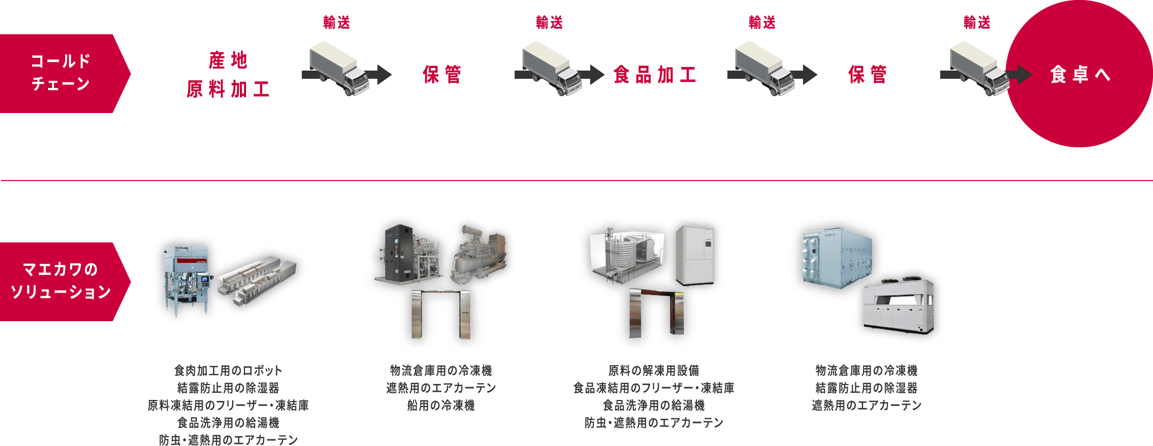 産業用冷凍機メーカーとして食の低温物流を支えてきたマエカワ。冷蔵倉庫以外には、超電導やLNG液化に必要な極低温の対応も可能。高温では、化石燃料を使わないヒートポンプで、ボイラーやバーナーの代替を提供できます。