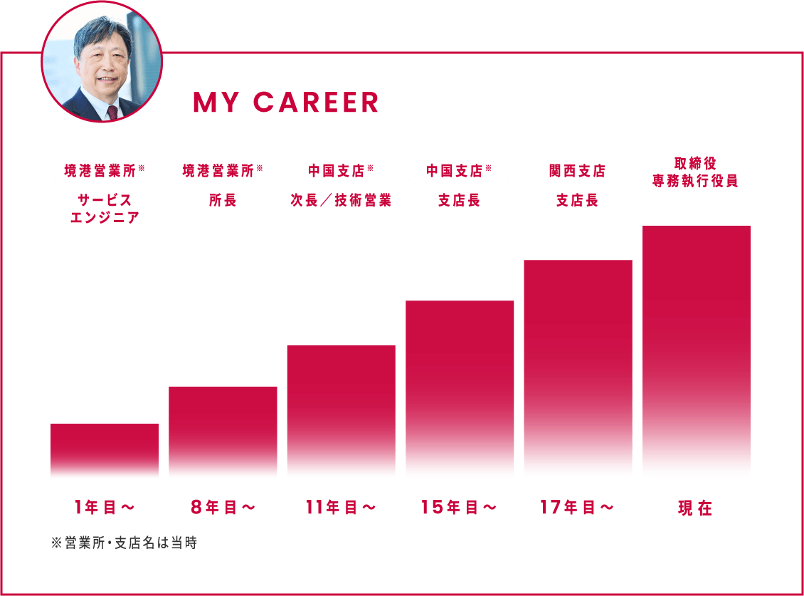 営業所のマネジメントを担う所長へ。役割は個人としての業務遂行から、営業所を動かすことへ大きく変化しました。限られたリソースでアフターサービスとプラント業務を両立させることが求められ、さらに市場拡大を目ざすためお客さまはもちろん地域の行政や商工会などとのと関係構築も大事な仕事になっていきました。